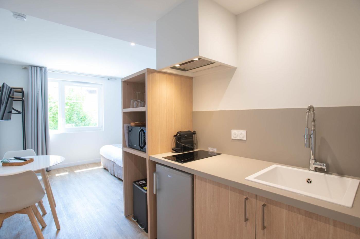 Appartement 1 Chambre. This apartment features 1 living room, 1 separate bedroom and 1 bathroom with a shower and free toiletries. Guests can make meals in the kitchenette that has a refrigerator, kitchenware, an oven and a microwave. The air-conditioned apartment features a flat-screen TV, a coffee machine, a wardrobe, heating as well as ancourtyard view. The unit has 2 beds. ;